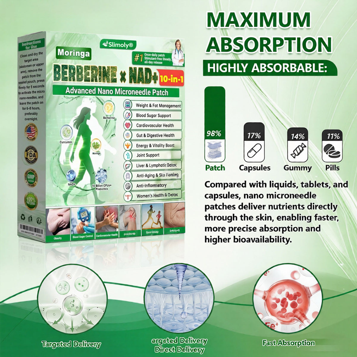 โ ย Easy Absorption: This formula uses an advanced nano microneedle patch with Berberine ร NAD+ activators to deliver key ingredients through the skin for targeted, gentle absorptionโbypassing the digestive system and ideal for sensitive digestion.