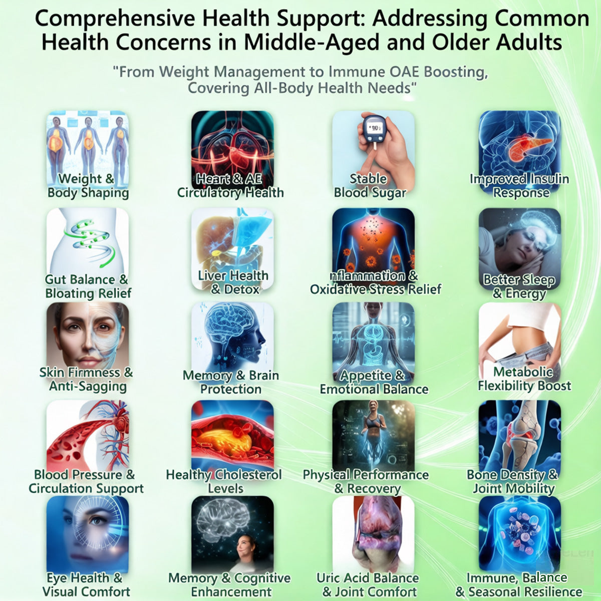 With aging, stress, and a fast-paced lifestyle, many people experienceย mood swings, anxiety, insomnia, memory decline, and brain fogย fromย blood sugar fluctuations, inflammation, low energy, and nervous system overload. For women,ย menopauseย can further intensifyย hot flashes, mood instability, and poor sleep.ย To address this, key ingredients work together:ย Ashwagandhaย lowers stress hormones and improves sleep;ย Magnesiumย calms the nervous system;ย Omega-3 and Ginkgo Bilobaย protect neurons and boost focus;ย NAD+/NMNย restore brain energy.ย Clinical data show that inย 2โ4 weeks, over 85%ย improved mood and sleep; inย 4โ6 weeks, about 80%ย saw better memory and less brain fog; andย over 79% of womenย reported menopause symptom relief. Overall, this combinationย stabilizes mood, restores brainpower, and keeps the mind clear and focused.